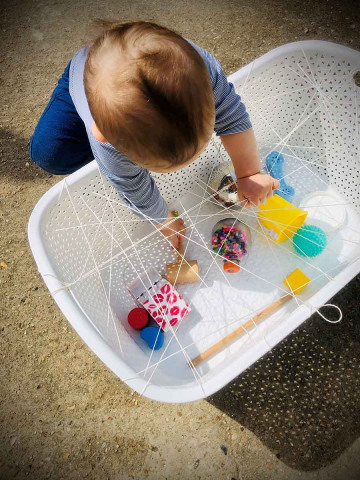 Vous êtes ici Accueil Détournez une panière à linge en toile d’araignée sensorielle Détournez une panière à linge en toile d’araignée sensorielle Activités 07/12/2023 Partager Facebook share Twitter LinkedIn WhatsApp Vous recherchez une idée d’activité simple à faire, qui demande peu de matériel et qui occupera votre enfant, même bébé, pendant un bon moment ? Florina, Directrice de notre crèche Babilou Cergy Petit Albi (95) a l’activité qu’il vous faut : la toile d’araignée sensorielle (testée et approuvée par son fils). Elle va permettre à votre enfant de faire travailler plusieurs de ses sens : La vue avec les différentes couleurs et formes des objets Le toucher avec les matières et les textures (ficelle, pvc, bois, aluminium…) qu’il pourra découvrir. L'ouïe avec le son que peuvent faire les objets en retombant dans la panière ou en se cognant entre eux. Cette activité demande de la concentration, de la patience et une certaine agilité pour réussir à sortir les objets sans les coincer dans la toile. C’est un exercice idéal pour permettre à votre enfant de comprendre les volumes, les espaces, les distances, et donc les prémices des mathématiques ! Activité panière sensorielle : quel matériel ? Pour réaliser votre toile d’araignée sensorielle, vous aurez besoin de : Une grande ou une petite panière trouée Des objets de différents tailles De la ficelle ou de la laine Astuce Si vous n’avez pas de panière, vous pouvez aussi le faire avec une grande passoire et des objets plus petits. Comment fabriquez sa toile d’araignée sensorielle ? Disposez les différents objets au fond de la panière. Tissez plus ou moins étroitement une toile en passant la ficelle par les trous de la panière. Veillez à ce que la ficelle soit bien tendue et attachée afin que votre enfant ne puisse s’emmêler dedans ou la délier. Proposez à votre enfant de venir toucher ou récupérer les objets présents à l’intérieur de la panière. Observez les différentes techniques utilisées par votre enfant pour y arriver Cette activité vous a plu et vous souhaitez en découvrir d'autres ? Voir toutes les activités